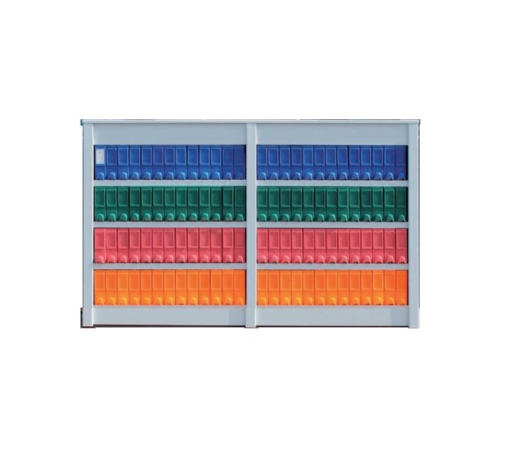 Sistema de almacenamiento superior para bloques. Cuerpo metálico completo de 4 filas y 104 bandejas dobles ABS provistas de divisores internos y frentes extraíbles de colores (color bajo demanda).